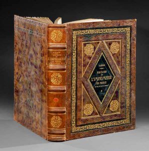 dorées, de lets dorés, d’une roulette dorée sur les nerfs, titre doré et pièce circulaire de maroquin rouge mosaïquée pour les tomaisons. Imposant décor à froid et mosaïqué sur les plats avec, au centre, les titres dorés. Tranches jaspées de plusieurs couleurs. Usure au coiffes du tome Iv avec manque en pied du dos. Quelques piqûres éparses. Nombreux fac-similés de typographies et de bois, avec plusieurs planches en couleurs hors texte. Le quatrième volume est consacré à Lyon. Ce monument avait été conçu pour l’Exposition Universelle de 1900.