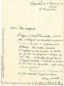 [Paris 15 mars 1920]. « Je suis vos chroniques et j’admire en vous un critique (c’est rare) et un homme d’esprit, un artiste raffiné (c’est rare) et un homme de sens. J’ai de vous un livre fort distingué que vous m’envoyâtes jadis de Lyon. L’estime où je vous tiens me fait bien précieux vos éloges »... Monastère de Saint-Benoît-sur-Loire (Loiret) 18 août 1922. « L’Argus m’avait fait connaître avant votre intelligente et charitable empressement les lignes de vous si profondément flatteuses. Une certaine discrétion m’empêchait de vous remercier de tout ce que je dois au perspicace critique que vous êtes, et les joies que je dois à l’original écrivain. L’occasion se présente de vous dire ma sympathie – déjà ancienne – et ma gratitude »...