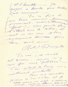 Correspondance amicale à son « cher gros » ou « cher obèse » [référence au Martyre de l’obèse, publié par Béraud en 1922]. Félicitations pour ses ouvrages et articles. [1921], sur Le Vitriol de lune : « j’ai été poursuivi, hanté par le supplice de Ravaillac. Tu as écrit là quelque chose de magnifique et d’horrible. Je voyais sa bouche qui hurlait. C’est saisissant. Tu as fait là un beau roman, passionnant, émouvant, merveilleusement “peint”. Une grande place t’attend dans les lettres »... – « Très bien ton article sur la statue de Barrès. Les grands morts ne devraient pas écrire “ni fleurs ni couronnes” mais “ni discours ni statues” »... [1934] : « Il y a quelques mois tu as publié un article magnifique Assez ! [...] Il exprimait l’écœurement, la colère d’une génération. [...] Depuis, tu as procédé à des exécutions que je n’ai pas approuvées. Certaines t’apparaissent comme des criminels que je considère, moi, plutôt comme des victimes, entraînées dans le remous d’une politique désordonnée. Mais à l’instant je viens de lire ta lettre au président Doumergue. C’est une noble page, Henri. [...] Tu peux te dire que tu viens de parler au nom de millions de Français »... En 1926, remerciements pour l’envoi de Ce que j’ai vu à Berlin et, en 1928, pour La Gerbe d’or, « qui est peut-être ton plus beau livre. Tu peux être fier de cette réussite »... En tant que président de l’Association des Écrivains Combattants, il déplore son départ : « Tu ferais un joli texte et me rendrais heureux en reprenant ta place au milieu de camarades dévoués qui t’attendent [...]. Nous donnons chaque année une vente de livres dédicacés qui est notre unique source de revenus, pour secourir nos malades, nos malchanceux »... « Je te demande au nom de tous les pauvres bougres que nous secourons de venir dédicacer tes livres. Toutes les célébrités littéraires seront là : de l’Académie aux cadets, des Maréchaux aux Goncourt »... Témoignages d’amitié suite à leur brouille : « Quelles absurdes raisons pourraient expliquer notre brouille ? Aucune. J’ai une trop profonde affection pour toi »... « Sache bien que de mon côté il reste quelque chose de notre amitié fanée – une amitié sincère [...] et que, quoiqu’il arrive, en toute circonstance, tu me trouveras à tes côtés sans rien espérer en échange »... Divers courriers pour fixer des rendez-vous, lettre de condoléances aux décès de Marthe Deladune et de Mme Béraud mère, nouvelles sur l’avancée de ses propres travaux et envois de livres, etc. On joint 7 télégrammes, une photographie du couple Dorgelès, 12 L.A.S. de Hania Dorgelès à Marise Dalbret, une copie d’une lettre de Béraud à Dorgelès, etc.