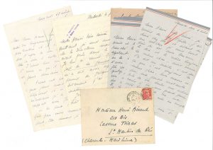 Important ensemble témoignant du drame de la condamnation de Béraud pour intelligence avec l’ennemi, et du soutien ardent et sans relâche de sa femme. # * Henri à Germaine (17 lettres), la plupart s.d., des années de guerre. « Dernière Heure : Messieurs les Allemands voudraient beaucoup m’offrir un voyage dans l’Est » (22 sept. 1941)... Récit d’un entretien avec le fondateur de Gringoire, « le plus singulier des hommes étranges », Horace de Carbuccia ; nouvelles du journaliste à Marseille pendant un voyage de Germaine à Paris (avril 1943) : arrestation de « 29 terroristes » à Saint-Didier, soucis pour leurs affaires, plaintes quant à l’incertitude du moment... Allusions à sa production, et instructions (dactylographie, etc.). Qqs petits croquis humoristiques. # * Germaine à Henri (1195 lettres), avril-juin 1940, novembre 1944-avril 1950. Expression exaltée de son admiration et son amour « infinis »... Rumeurs de la bataille de Narvik (avril 1940)... Inquiétude pour Henri alors qu’elle s’embarque pour l’île de Ré (3 juin 1940)... La correspondance reprend après la Libération, en novembre 1944, alors que l’écrivain est accusé d’intelligence avec l’ennemi : Germaine l’exhorte à garder confiance, tape avec soin le « remarquable rapport » de l’accusé au juge (4 nov.), fait sienne la souffrance de son mari qu’elle encourage à créer un nouveau chef-d’œuvre... Elle fait la connaissance devant la prison de Fresnes de la femme de Combelle, la sœur de Brasillach, la mère de Benoist-Méchin... Me Ribet a décliné de l’assister (il a défendu Daladier), mais Mes Leroy et Naud prouvent la bonne fois de l’accusé... Le « verdict infâme » déshonore ceux qui l’ont prononcé ; le nom de Béraud est « le signe de la noblesse et de la grandeur » (30 déc. 1944)... Elle tape deux versions de sa demande de grâce qu’elle montrera « à F.M. [Mauriac] qui connaît certainement les points sensibles et les réactions du général » (7 janv. 1945)... La commutation de sa peine la fait pleurer de joie : « tes ennemis ne sont pas les plus forts et un début de justice commence pour toi » (12 janv. 1945)... Elle fait part du soutien et de l’affection de P. Brisson, W. d’Ormesson, Pépita Caspar-Jordan, G. Chevallier, les Dorgelès, R. de Nys, etc. Joie de leurs visites au parloir : « ma souffrance est provoquée uniquement par la tienne » (6 mars 1945)... Longues lettres à l’anniversaire de son arrestation (24-25 août), et au 11-Novembre 1945 (échos de l’anglophobie de Béraud)... Extrait de « Libérez Henri Béraud » de J. Piot dans Paroles françaises (2 août 1946)... Béraud, transféré au « bagne » de l’île de Ré, lui fait un « récit bouleversant » de son « martyre » [Quinze jours avec la mort ?] (22 mai 1947)... « Que tes bourreaux soient maudits à jamais pour tout ce qu’ils t’ont fait souffrir depuis trois ans ! Qu’ils soient bénis peut-être aussi, les malheureux, pour ce que tu as créé depuis l’affreux drame. [...] Quelle revanche » (10 juil. 1947)... Elle ne cesse d’espérer une nouvelle grâce présidentielle, et fait part de ses échanges avec ses défenseurs, Mes Leroy et Michaud... « Mon Henri bien-aimé, beau, beau parloir ! [...] Ces merveilleuses minutes me laissent toujours un souvenir enchanté et me donnent mon Amour toute la patience que tu attends de moi. Je vis pour elles, par elles. Je revis notre bonheur passé et j’attends le prochain » (4 avril 1950)... Outre une liste de « lettres reçues depuis une quinzaine de jours » où figurent les noms de Billy, Brisson, Dorgelès, etc., on rencontre dans cette correspondance les noms de Fr. Bernouard, Maurice Garçon, Galtier-Boissière, Pierre Scize, etc. Relevons aussi une belle lettre de Béraud à sa mère, 10 août 1916, avec un « Souvenir de Verdun » d’un de ses hommes ; et une trentaine de lettres de proches, à Béraud, de son père (3, 1904-1908), de membres de sa belle-famille Batailler, d’un filleul, de neveux et nièces, etc. # Plus environ 150 lettres et cartes à Germaine ou Henri prisonnier (qqs minutes de réponse) : Pierre Benoit, Pierre Brisson, Christian Casadesus, Pépita Caspar-Jordan (plus de 30), Robert Delamarre, Jacques Hébertot, Roger Nimier, Émile Vuillermoz, etc. On joint un article dactyl. sur les Béraud à Ré, et les visites de Germaine à la prison.