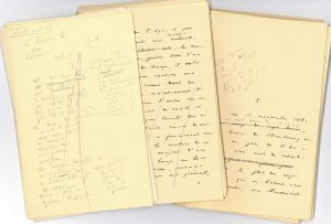 Sa propre bibliographie, chronologique et par genres, avec projets ; plans et listes d’ouvrages à faire ; gros dossier de notes Paysans ; série de notes et phrases des années 20 sur petites fiches bristol ; esquisses et ébauches de contes, sujets de nouvelles (dont un « Livre fou ») ; carnet de pensées et aphorismes intitulé Le nouveau Pascal ; dossiers de notes sur le « Phono » et sur Lyon et le P.L.M. ; séries de citations sous le titre De qui est-ce ? et Les gaités du Larousse ; mots croisés ; notes de voyages, notes et ébauches diverses, etc.