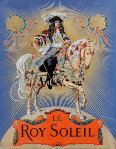 Toudouze (Gustave). Le Roy Soleil. Paris, Boivin, 1917. Un volume, in-4, cartonnage polychrome de l’éditeur personnalisé, sur percaline bleue, titre dans un cartouche rouge, tranches dorées. Coiffes froissées.