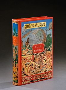 Verne (Jules). L’île Mystérieuse. Paris, Hetzel, s. d. Un volume triple, in-8, cartonnage éditeur polychrome, dos à l’encre, tranches dorées. Reliure Engel.