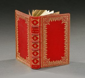 (1) p., pleine reliure en maroquin rouge. Dos à cinq nerfs très orné et doré portant le titre doré, large dentelle d’encadrement dorée sur les plats, filets dorés sur les coupes, dentelle intérieure dorée, tranches dorées sur marbrure. Un frontispice et 9 jolies vignettes signées D... (Durand). Très bel exemplaire dans une reliure pastiche du XVIIIe siècle de très grande qualité, réalisée et signée, par le relieur Perreau (Paris, seconde moitié du XIXe siècle).