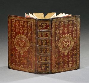 de Saint François. Paris, Compagnie Des Libraires, 1671. Un volume, in-12, de (2) ff., 836 pp., pleine reliure ancienne en maroquin rouge. Dos à cinq nerfs orné entre les nerfs d’un monogramme couronné encadré de fleurs de lys. Large dentelle d’encadrement dorée sur les plats, qui portent dans un semis de monogrammes couronnés, des armes dorées ; roulette dorée sur les chasses, tranches dorées. Restaurations discrètes bien réalisées. 5 gravures et texte réglé. Plein maroquin rouge aux armes de France avec semis de fleur de lys et chiffre couronnés.