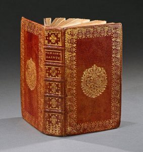 de l’époque en maroquin rouge. Dos à cinq nerfs fleurdelysé et doré portant le titre doré. Large dentelle d’encadrement dorée sur les plats portant des armes dorées, roulette dorée sur les chasses, tranches dorées. Petites usures sur les coins. Plein maroquin rouge aux armes de Marie-Josephe de Saxe, mère de Louis XVI, fille de Frédéric Auguste II roi de Pologne, deuxième femme de Louis Dauphin fils de Louis XV, morte en 1767.