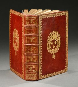 pp., 654 pp., (2) p., Lx pp., pleine reliure de l’époque en maroquin rouge. Dos à cinq nerfs orné de fleurs de lys dorées dans des caissons de filets dorés, dentelle dorée d’encadrement sur les plats, armes dorées aux centre des plats. Roulette dorée sur les coupes et les chasses, tranches dorées sur marbrures. Reliure en maroquin rouge aux armes royales dorées sur les plats. Bel exemplaire.