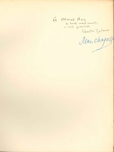 tirée à 560 exemplaires, avec envoi autographe signé de l’auteur, signé aussi à l’encre bleue par Chagall : « à Marcel Ray de toute mon amitié en toute gratitude André Salmon Marc Chagall ». [Marcel Ray (1878-1951), écrivain et critique, était un grand ami de Valery Larbaud, avec qui il entretint une importante correspondance.]