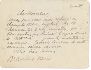 Maurice DENIS (1870-1943). L.A.S., Lundi [1899 ?, au collectionneur Maurice Fenaille] ; 1 page oblong in-12. « Venez donc voir mon refusé du Champ de Mars, en place, chez M. Chausson 22 Bd de Courcelles »...