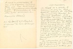 contemporain, 1907). [Vers 1907]. C’est Gabriel Thomas, le directeur du Musée Grévin, qui a acheté ses dessins, avec le droit de reproduction ; mais, « tout en appréciant l’archaïsme de votre traduction », Thomas hésite à choisir la version de Cochin, et consulte à ce sujet Pératé et Morel-Fatio : « Un livre illustré s’adresse avant tout à des bibliophiles préoccupés surtout des agréments extérieurs du livre. Il leur faut une traduction facile à lire, et qui s’adresse plutôt à des gens du mondes qu’à des raffinés ». Denis est bien embarrassé, d’autant que cela retarde « la mise en train du graveur (Jacques Beltrand, un de ceux qui ont gravé l’Imitation, et un des maîtres actuel du Bois en couleurs »… – Il a remis à Adrien Mithouard le manuscrit de Cochin, dont il recevra bientôt les épreuves ; il a revu le texte avec André Pératé, dont l’admiration a encore augmenté, à part quelques vers faciles à modifier. Gabriel Thomas ayant renoncé à faire seul l’édition, il en laisse le soin à la société de bibliophiles dont il fait partie, Le Livre contemporain : « le livre ne devant être tiré qu’à 100 exemplaires répartis entre les 100 membres de la société, il s’ensuit que nul ne sera mis en vente » ; et Denis craint qu’on n’offre à Cochin que deux ou trois exemplaires... – Indication de l’emplacement d’illustrations et de lettrines dans le volume... Saint-Germain 4 août [1908 ?]. « Quelle joie d’être compris et approuvé par un érudit-poète tel que vous, lorsqu’il s’agit du poème que personne au monde ne connaît mieux que vous ! » Il remercie Cochin de ses efforts en faveur de la diffusion de leur « œuvre commune ». Il est en plein travail : « J’ai l’ambition de terminer mon immense Psyché pour le Salon d’Automne »... Silencio [Perros-Guirec] 18 septembre [1914-1918]. Il ira probablement dans le secteur de Claude Cochin, mais « il me dit qu’au point de vue des émotions religieuses c’est moins bien chez lui que chez Charpentier »... Mercredi [1914-1918]. Il s’inquiète des angoisses de Cochin… « C’est fabuleux ! Comment ? Au mépris de nos statuts, imposer un credo esthétique à nos membres, seulement liés jusqu’ici par le lien religieux et le lien professionnel, et cela au moment où la plupart sont au front incapables de protester ! Pendant qu’un Barbier se bat, des bavards l’excommunieraient à cause de ses coupes de pierre ! Alors que dans toutes les Sociétés d’Art, l’union sacrée interdit toute discussion d’école, en instituer une chez nous !! »... 5 novembre. Il remercie Cochin d’avoir recommandé son article à M. Trogan pour le Correspondant ; il a été « écrit à la diable » pendant son séjour à Genève, près de sa femme dont la santé l’angoisse… « Je vous dirai l’amélioration de mon œil, ce dont vous remercierez Dieu »… 17 avril [1922 ?]. Barthou a parlé à Gabriel Thomas des chances que Cochin aurait au fauteuil de son frère : « son intention serait de vous y pousser »... 6 octobre [1923 ?]. « Je fais une mosaïque pour la cathédrale de Quimper ; une peinture pour Contrexéville, l’art sacré a du succès à Jersey. [...] Et en Belgique, où la bataille a été dure, les Dominicains m’invitent à faire une conférence sur l’art religieux moderne »... Dimanche. « Votre étude est un chef-d’œuvre, et je ne sais comment vous en dire ma satisfaction. Vous avez su ranimer de vieux souvenirs qui me sont chers, et donner à tout cela le charme d’une ancienne peinture. [...] c’est la première fois, que [je] me sens portraicturé avec un tel scrupule, et aussi avec une telle cordialité [...]. Et quelle clarté dans la définition du rôle symbolique de l’émotion de nature ; c’est exact et lumineux »...