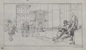 Hubert-François GRAVELOT (1699-1773) peintre, dessinateur et graveur. Dessin original pour Les Caractères de La Bruyère ; mine de plomb et plume sur papier traçant ; 8,3 x 14 cm. Dessin destiné à illustrer Les Caractères de Théophraste...