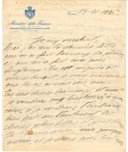 Direzione generale delle pensioni di guerra. Belles lettres d’amour. 24 septembre, à « Joséphine, my love ». C’est avec grand plaisir qu’il a reçu sa lettre, heureux de voir qu’elle n’oubliait pas son « petit amour Pepito ». Il pense beaucoup à elle, et, en regardant leur photo, à tous les « moments gentils que nous avons passé ensemble. Vous dites que vous m’aimez un peu [...] c’est vrai ? » Quant à lui il en est sûr : c’est de l’amour qu’il éprouve, mais il ne sait pas s’il finira par l’aimer sérieusement. Car que peut-il faire pour elle ? En ce moment il cherche du travail, et de préférence à Paris : « comme ça je pourrais retourner dans la ville lumière que j’adore parce que tiens comme une prisonnière my sweetheart Joe. Mais aura-t-elle toujours pour Pepito la même sympathie ? » Paris est grand et on y oublie facilement. Il espère qu’elle a reçu le petit mot et le cadeau qu’il lui a fait déposer : « c’est pas grand-chose, mais je ne suis pas richman »... Il lui demande de lui écrire souvent, de lui dire s’il a été remplacé, ou « o mon amour s’il y a toujours pour moi une petite place dans votre cœur »... [Début octobre] (le début manque). Il est certain de l’aimer à l’infini, mais il se demande si les sentiments de sa petite Joe à son égard seront toujours les mêmes, s’ils dureront : « mon caractère est un peu drôle, quand j’aime je suis un peu jaloux, c’est pas ma faute mais c’est un joli cadeau naturel que mon pays avec ses fleurs d’oranger m’a donné ». Il parle de la Sicile, pays où les sentiments sont sacrés lorsqu’on est amoureux, et termine en embrassant bien fort « My love, my wonderful baby »... 13 octobre, à « Joe, my sweetheart ». Sa lettre l’a fait « rêver pour longtemps » et l’a rassuré : il sait maintenant qu’elle est sincère envers lui « Tu es mignon [...]. Tu me désire beaucoup, et moi ? Je voudrais, my love, te serrer à mon cœur et je voudrais t’embrasser bien fort en te disant les choses les plus folles et les plus douces. Je t’aime aussi, ma poupée adorée, et je désire avec tout mon âme de réaliser notre rêve ». Il a mis les photos d’elle dans sa chambre et s’imagine ainsi dormir avec elle... Il projette de quitter son ministère, où il n’a aucun avenir, et de venir la rejoindre à Paris, « la ville qui tiens prisonnière my great love ». Il est prêt à accepter un travail modeste, pourvu qu’il puisse vivre près de son amour... Il lui reproche de boire trop, alors qu’elle lui avait promis de faire attention : « Si tu m’aime plus je préfère que tu m’aime sans champagne, si tu m’aime moins il veut dire que tu cherche de m’oublier, et alors c’est pas amour mais méchanceté ». Il se montre passionné : « À toi mon grand amour, mon cœur, mon âme, mes lèvres », pour l’embrasser, et signe : « Ton Pepito qui t’aime, qui tu aimes et qui t’aimera pour s’aimer toujours ».