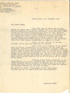 Joséphine BAKER. 2 doubles de lettres dactylographiées, Monte Carlo 2 décembre 1970, à son fils Moïse et le concernant ; 1 page in-4 chaque. Émouvante lettre à « Mon petit Moïse », son fils adoptif, qu’elle a envoyé dans un...