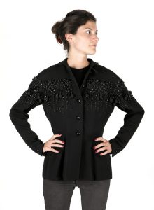 [Joséphine BAKER]. Pierre BALMAIN. Veste noire de tailleur « Toréador » Balmain aux pampilles de soie noire et perles de jais. La veste porte l’étiquette Pierre Balmain. On joint 3 photos de Joséphine Baker avec cette veste.
