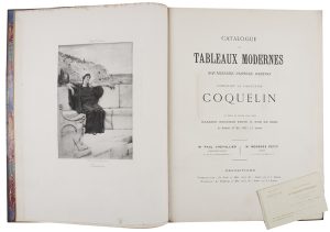 1893) ; in-fol. illustré de nombreuses planches en héliogravure, relié demi-maroquin tête de nègre à coins (qqs éraflures). – Catalogue de tableaux modernes… pastels, aquarelles, dessins… composant la collection C. Coquelin (id., 9 juin 1906) ; petit in-fol. illustré de nombreuses planches en héliogravure, broché. – Catalogue des tableaux, aquarelles, pastels, dessins… composant la collection de M. Coquelin Aîné (Hôtel Drouot, 3 juin 1906, MM. Bernheim jeune experts), in-4 illustré de nombreuses planches photographiques, broché.