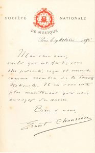 chez Holmès pour propager l’œuvre de Franck), Ernest Chausson (2, pour la Société Nationale de Musique), Théodore Dubois (10, à son ancien élève), Mita Feustel (à propos de spectacles à Bayreuth, 1886), Jean Gounod, Alexandre Guilmant (2), Ernest Guiraud, Vincent d’Indy, Xavier Leroux (2), Jules Massenet, Gabriel Pierné (6, 1925-1937), Camille Saint-Saëns (1912, à propos de l’interprétation de La Damnation de Faust), Augustin Savard, Ambroise Thomas, Charles-Marie Widor.