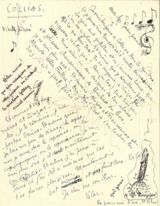 il a adhéré à l’Association Jeune France : ils ont organisé une exposition de jeunes peintres, des concerts musicaux d’André Jolivet, Chailley, Tony Aubin, etc. Toutes les disciplines artistiques sont représentées à Jeune France : Architecture, Belles Lettres, Peinture, Radio, Théâtre, etc. « En théâtre, J. F. [Jean Françaix] a patronné et aidé financièrement Le Bout de la route de Giono (150 repr.) qui n’est d’ailleurs pour moi qu’une pièce conservatoire ». Il a dirigé la section théâtre, tâche administrative qui l’a ennuyée, et est chargé de la collection de Textes dramatiques. Il est parti en tournée en Anjou avec George Dandin (rôle de M. de Sotenville) et une farce dont il est l’auteur [La Farce des filles à marier]. L’expérience a été si heureuse et le succès si gros qu’il espère repartir au plus vite, et pour longtemps... Château-La-Vallière 10 septembre [1942]. Il est en tournée en province depuis le 2 juillet avec la troupe qu’il dirige, « Les Comédiens de la Roulotte » : ils jouent La Fontaine aux Saints de Synge, Il ne faut jurer de rien de Musset et George Dandin, « exploitation faite par nos seuls moyens et qui jusqu’ici a été excellente. Nous en sommes à la 75e de Synge ! Je joue le rôle de Martin Doul, l’aveugle. Nous espérons le jouer cet hiver à Paris. – Je me suis marié le 30 juin dernier avec Andrée Schlegel »... Collias, s.d. Amusante lettre avec dessins, toute en rimes farfelues en as. En haut de page, il trace une grande clé de sol et des notes de musique, comme pour accompagner la chanson : « Je suis toujours à Collias dans le gardas et je pense mon temps (n’as) à écouter des musicas Les gens sont gentillas et on s’amuse bienas, que c’en as rigolas. Et même que je couillonne pass »… Etc. Au bas de la feuille, il dessine une verge en érection, avec la légende, sous les testicules : « Melle Rouzigas ! ». Au dos de la lettre, dessin sur toute la page, divisée en quatre : au centre, dessin d’un fessier féminin, d’où partent des rayons dans les quatre directions : Paris, Vence, Collias, Sète.