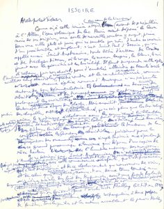 l’art ancien et moderne, en 1961. Le brouillon de premier jet, très raturé et surchargé de corrections, est suivi de la mise au net, présentant encore quelques corrections, et signée ; tous deux sont écrits à l’encre bleue. « Comme si, à cette dernière étape au cœur de la Limagne, avant de se mésallier avec l’Allier, l’eau volcanique du lac Pavin avait déposé la lave noire de ses origines, une sorte de merveille sombre y surgit, prise dans une ville plate et pavée et qui ne semble par rien d’autre se souvenir d’un passé terrible et sanglant : c’est Saint-Paul d’Issoire qu’on appelle aussi Saint-Austremoine »… Aragon rappelle la forme de cette église romane d’Auvergne, « assurément celle dont le plan a le plus d’audace et d’ampleur ». Reconnaissant les altérations dues à l’architecte Malley, tant décrié pour la façade et le clocher qu’il fit bâtir en 1841, il clame son admiration pour l’entrée : « je lui trouve cette beauté mâle d’une poitrine de géant, de lanceur de javelot, qu’on s’étonne de ne pas voir soulevée par une respiration puissante, par le feu profond de la terre dans ses schistes sont à jamais noircis, et qu’est-ce pour eux que sept ou huit siècles de plus ou de moins ? »... Le « gros œuvre diabolique » le prend à la gorge, tel « un théâtre volcanique encore léché de flammes récentes. [...] Je m’arrête dans le narthex comme un homme excommunié, je regarde cet acheminement devant moi vers le chœur, sous cette voûte de cécité, ce pavement d’arkose à tomber à genoux, et le flèchement du jour entre les piliers, qui semble destiné au sol seul, à cet impitoyable porphyre obscur. Et je comprends enfin ce qui procure à tout cela cet air de tragédie, ce silence criard » : le badigeon dû à un certain Dauvergne en 1862, qui indispose les « amateurs éclairés » aujourd’hui. On sait bien pourtant « qu’en ce fameux douzième siècle français où tout a été inventé de la poésie et de l’amour, il devait y avoir ici du haut en bas des pierres un coloriage qui ne tenait nul compte de leur ascétisme des yeux. Plus sauvage sans doute que ce qu’imagina ce peintre, l’année de l’expédition du Mexique, et tout encore comme cet art d’Auvergne inspiré par les flammes d’un enfer terrestre, en ce pays d’invasions et de reflux d’armées »... Il défie tout ce monde de préférer le « vaisseau démâté » du XVIIIe siècle ; Malley et Dauvergne n’ont pas restauré Saint-Austremoine, ils l’ont achevé. Déjà « n’admirons-nous pas des églises gothiques, qui furent faites du massacre d’une architecture gothique, ne trouvons-nous pas naturelles à Chartres les parties Renaissance surajoutées, déjà ces dernières années nous avons cessé de nous indigner de l’immixtion du baroque jésuite dans les cathédrales flamboyantes »... Un jour on admirera le XIXe siècle d’avoir amené le rêve à maturité : « là-haut, dans les chapiteaux, centaures, oiseaux d’Orient, arums, racontent des histoires dont le sens est perdu, mais les [...] crimes contre Dieu dont ils témoignent se marient aux péchés modernes, et les draperies peintes retombent à la fois sur les paradis Napoléon III et les luxures de la Terre promise, sur les bosquets d’Armide et les jardins d’hiver de Nana... »
