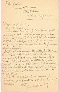 [Paris 17 décembre 1897]. Il ne pourra pas déjeuner demain chez Mlle Dallet : « je travaillerai toute la journée. Le sort en est jeté. Antoine l’exige »... Étretat [vers 1899]. « Les ouvrages de théâtre ne sortent pas encore. Je ne me suis occupé depuis mon arrivée ici que du Jeune Homme rangé ». Le principal attrait d’Étretat est Fernand Vanderem, avec qui il cause « principalement de sa littérature et de la mienne »... Paris 9 août 1901. Son « médaillon » sur Le Mari pacifique est excellent ; il faut tirer un meilleur parti de la publicité du Journal... [7 avril 1903]. Il ignore l’adresse du médecin, et « même ce détail de la vie de Porto Riche. Je connais quelques spécialistes pour les oreilles »... Étretat 21 août. Il a fait sa commission à Boulenger. « Dans mon opérette que je fais pour les Mathurins, il y aura un charmant petit rôle pour Blanchet, et j’en ai déjà parlé à Tarride »... Paris 17 octobre. « Vraiment, quand vous vous en donnez la peine, et quand vous n’êtes pas trop malveillant, vous faites preuve d’une clairvoyance et d’une pénétration étonnantes, et vous écrivez fort bien »... Paris. Son instantané était tellement bien, « que depuis ce matin je commence à me sentir de la sympathie pour Tristan Bernard. Après tout ce que je sais sur lui !... Mais ne soyons pas trop injuste. C’est un bon bougre. Et vous êtes aussi un bon bougre. Et quand je ferai un instantané sur vous, je dirai que vous avez dans votre grand corps tellement de talent, qu’il vous en sort encore tout plein par vos gros yeux éclatants. Ne vous plaignez pas de cette remarque : c’est à peu près ce que Saint-Simon écrivait de Fénelon, d’une façon moins ingénieuse »... Ailleurs, il est question de répétitions, de places à donner, d’un rendez-vous, d’articles pour Le Journal...