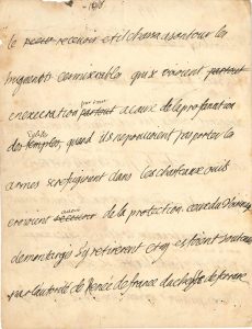 quelques péripéties de la première guerre de Religion, commet quelques maladresses que son précepteur corrige (nous relevons les principales modifications) ; on appréciera notamment sa présentation plus favorable du duc de Guise, chef catholique. « En mesme temps le duc de Guise qui estoit arrivé au camp marcha vers Blois que les protestants avoient occupé. Leur garnison se retira a sa venüe mais quoy qu’il fust entré dans la ville sans aucune resistance, il ne l’abandonna pas moins a la fureur des soldats. Environ ce temps on eut nouvelle a la Cour que le duc de Mont-pensier avoit reduit a l’obeissance du roy la ville et le chasteau d’Angers et que La Rochelle où les protestants [taschoient de se rendre maistres Bossuet a corrigé : La Rochelle que les protestants taschoient d’occuper] luy avoient ouvert les portes. Le maire d’intelligence avec ce prince avoit introduit des gents qui se meslant avec les huguenots et criant comme eux vive l’Evangile (car c’estoit le cri ordinaire dont ils se servoient lors mesme qu’ils faisoient les plus grands desordres) [avoit remis la ville entre les mains de Barie que le duc y avoit envoié Bossuet a rayé et corrigé : se rendirent les plus forts]. Ces nouvelles donnerent courage aux catholiques de faire de nouvelles entreprises. [Bossuet ajoute : Au commancement du mois de Juin] Le duc de Guise s’avança vers Tours qui se rendit, l’armée y exerça de grandes cruautez selon la malheureuse coutume [de ces temps biffé par Bossuet et corrigé : des guerres civiles. Et il ajoute : Mais le duc taschoit toujours de les moderer.] Chinon et Chastellerault se soumirent »... Etc.