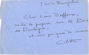 font un service ? »... – 9 rue de Beaujolais. « Voilà le papier sur le Bois de Boulogne, et une poignée de main »... – « Cher ami, ma dactylo est absente, pouvez-vous faire taper ceci et me renvoyer mon manuscrit ? »... – Un peu malade, elle propose de remettre son prochain papier au mois prochain, « j’entends le 20-25 de ce mois-ci. [...] Voulez-vous un papier sur l’abondance (?) de l’automne ? »...