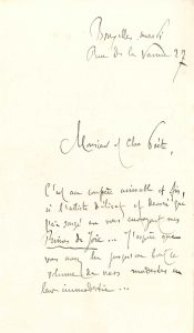 délicat et dévoué que j’ai songé en vous envoyant mes Rimes de joie... J’espère que vous avez lu jusqu’au bout ce volume de vers modestes en leur immodestie... Vous me rendriez bien heureux – et bien fier à la fois – si vous daigniez me dire dans votre journal si lu, le bien ou le mal que vous pensez de ce recueil où j’ai mis beaucoup de moi »... – Mardi, à une dame : « Veuillez avoir l’obligeance de me dire la nature des renseignements que vous attendez de moi. Impossible de bouger, un travail urgent »...