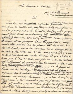 Abel HERMANT (1862-1950). Manuscrit autographe signé, La Saison à Londres III, [1934] ; 9 pages petit in-4. Sur la saison mondaine à Londres. « Londres est infini. On ne saurait dire que le centre est partout et la circonférence nulle...
