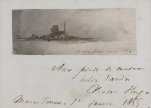 12,5 cm (à vue), encadré avec l’adresse autographe au dos. Petit paysage à la plume et au lavis d’encre brune, et estompe, représentant une bourgade dans le lointain, avec la grosse tour d’un château-fort, et les flèches d’une église. Cette « carte de vœux » est signée et datée en bas à droite : « Victor Hugo. Jersey 1854 ». Victor Hugo l’a montée sur un feuillet de papier sur lequel il a inscrit la dédicace : « Aux pieds de Madame Jules Janin Victor Hugo Marine Terrace, 1er janvier 1855 ». Au verso, l’adresse porte : « Monsieur Jules Janin 20, r. Vaugirard ». Adèle Huet (1820-1876), fille du maire d’Évreux, avait épousé en 1841 le célèbre critique Jules Janin (1804-1874).