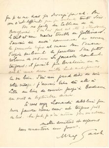 acceptera son hospitalité avec joie, lorsque la démangeaison de partir le prendra : « J’irai vous voir et point ne sera besoin de dom Chauvin ni d’aucune conférence pour cela. [...] Vous êtes de ceux à qui l’on pense et à qui on n’a pas l’idée d’écrire parce qu’ils sont présents à la pensée : Picasso et moi qui ne nous sommes pas quittés pendant vingt années ne nous écrivons jamais, pas même au jour de l’an. J’ignorais d’ailleurs la conférence de dom Chauvin, et j’entends si souvent parler de St Benoît et même par dom Chauvin que je ne me serais pas dérangé pour cela. [...] Vous me parlez du Tableau de la Bourgeoisie. J’en ai fait cet été 9 illustrations. Le tout est aux mains terribles de Gallimard. J’aurais dû aussi commencer un roman. La première ligne est encore dans l’encrier. J’espère seulement la parution d’un petit volume de vers. – Les gouaches roulent toujours : il paraît que Bernheim en a acheté une deux mille huit cent francs »... Il le charge, en terminant, de dire à Leonardi que « mon pauvre vieux cœur est toujours près de lui »...