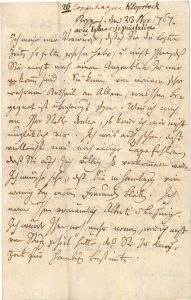 ancien élève Christian VII de son poste de conseiller royal et secrétaire du Cabinet, et alors que Reverdil se prépare à quitter le Danemark pour retourner en Suisse. Ich mache mir Vorwürfe, daß ich Sie die lezten Zeiten so selten gesehen habe, und nicht Ihnen, daß Sie nicht noch einen Augenblik zu mir gekommen sind. Sie können von meinem sehr wahrem Antheil an Allem, was Ihnen begegnet ist überzeugt seyn. Wenn ich mich an Ihre Stelle denke, so komme ich mir nicht unglüklich vor. Ich weis auch schon, daß vielleicht nur noch einige Tage fehlen, daß Sie auch sich völlig so vorkommen werden. Ich wünsche sehr, daß Sie in Hamburg ein wenig bey meinen Freunden bleiben. Ich nenne Ihnen vornämlich Alberti und Lessing. Ich würde Ihnen noch mehr nennen, wenn ich nicht von Sturz gehört hätte, daß Sie zu kurze Zeit für Hamburg bestimmten. Lassen Sie sich von Alberti erzählen, was er von mir und dem Grundte denkt, wie ernsthaft, oder wie scherzhaft unsere Liebe, oder Zuneigung, oder Freundschaft ist, das allein wird zureichend seyn Sie dahin zubringen, daß Sie von einer Ecke seines Hauses bis zur andern lachen werden. Ich habe mir ferner alle Mühe gegeben, diesen Brief leserlich zu schreiben, allein es soll mir gleichwohl lieb seyn, wenn Sie Ihre Zuflucht zu Alberti nehmen müssen, um ihn völlig lesen zu können. Denn so bin ich gewiß, daß Sie sich sehen. Mit Brandt, mit dem ich in der lezten Zeit ein wenig mir misvergnügt zu müssen seyn Ursach zu haben glaubte, hab ich mich, wegen seiner Begleitung, völlig ausgesöhnt. Wenn sich auch ein wenig Eitelheit eingemischt hätte, genug er hats gut gemacht. Wenn Sie durch Halberstadt reisen müssen Sie notwendig Gleim sehn, in Magdeburg (ich weis nicht, ob er schon in Berlin ist) Bachmann, in Berlin [Karl Wilhelm] Ramler, und in Dresden [Gottlieb Wilhelm] Rabener, diese sind alle alte Freunde von mir. Geben Sie mir, oder lassen Sie mir durch Alberti einige Nachricht von mir geben, und glauben Sie, daß ich sehr aufrichtig sey der Ihrige Klopstock. Il se reproche d’avoir vu si rarement Reverdil dans les derniers temps, mais ne le blâme pas de n’être pas venu même un instant vers lui. Reverdil peut être persuadé de la part très sincère que Klopstock prend à ce qui lui est arrivé. Quand il se met à sa place, il ne peut pas se sentir tout à fait malheureux. Il sait que dans quelques jours seulement peut-être, Reverdil pourra être dans les mêmes sentiments. Il lui souhaite vivement de séjourner un peu à Hambourg avec ses amis, notamment avec Julius Gustav Alberti (1723-1772, théologien et prédicateur) et avec Gotthold Ephraim Lessing (1729-1781, dramaturge). Il pourrait en nommer d’autres, s’il n’avait pas appris par Helfrich Peter Sturz (1736-1779, écrivain, secrétaire au ministère danois des Affaires étrangères) que Reverdil ne devait rester que trop peu de temps à Hambourg. Alberti lui dira ce qu’il pense de lui, et combien sérieux ou railleur est leur amour, ou affection, ou amitié, et cela suffira à le faire rire d’un coin de la maison à l’autre. Klopstock s’est appliqué à écrire lisiblement sa lettre [en tête, Reverdil a noté : « avec labeur je puis la lire »], mais il sera heureux que Reverdil fasse appel à Alberti pour la déchiffrer entièrement. Car il est sûr qu’ils se verront. Quant à Envold Brandt (1738-1772courtisan danois, et favori de Struensee), qu’il croyait avoir été quelque peu mécontent de lui, il est tout à fait réconcilié avec lui en raison de sa conduite. Même si un peu de vanité y est mêlée, il a plutôt bien agi. Si Reverdil se rend à Halberstadt, il doit absolument y voir Johann Wilhelm Ludwig Gleim (1719-1803, poète), et à Magdebourg (s’il n’est pas déjà à Berlin) Heinrich Wilhelm Bachmann (1737-1776, négociant et mécène), à Berlin Karl Wilhelm Ramler (1725-1798, poète et critique), et à Dresde Gottlieb Wilhelm Rabener (1714-1771, écrivain satirique), tous sont de vieux amis de Klopstock. Il demande enfin à Reverdil de lui envoyer de ses nouvelles, ou de lui en faire donner par Alberti… Remerciements à Eberhard Koestler pour son aide dans la transcription de cette lettre.