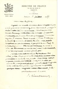bibliothécaire à Sainte-Geneviève (Bibliothèque Jacques Doucet également) donnera chez elle [...] une petite réception en son honneur, à propos de son Prix de la Critique, je pense. Elle serait heureuse de vous y voir, et Bonnerot en serait ravi aussi »... Il a relu son article sur la destruction des lettres d’Adèle Hugo. « Une fois de plus je vous le dis avec grand plaisir : grand intérêt toujours de vos articles de ce genre, apprenant toujours quelque chose, toujours merveilleusement faits »...