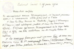 [Guy de MAUPASSANT (1850-1893)]. Jean de BONNEFON (1867-1928). L.A.S., Calvinet (Cantal) 19 juin 1926, à Georges Normandy ; 6 pages oblong in-4, cachet encre Mairie de Calvinet, enveloppe. Mise au point nobiliaire sur Maupassant, adressée à...