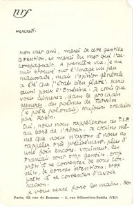 croix, si le ministère la lui proposait. [...] Ce serait flatteur pour ceux qui la portent déjà ; et quelle meilleure occasion pour un banquet »... Paris jeudi [1938-1939 ?]. « Le prochain Thibaudet est sur la Critique. Dans deux mois. Merci. Je suis bien content que tout cela vous plaise. Il y a aussi l’Heraklès (toute une critique du mythe d’Hercule) […] Avez-vous lu le Château de Kafka ? Désirez-vous le recevoir ? C’est une grande chose »... Lundi [1944]. « Je viens de perdre ma mère, emportée en deux jours par une congestion pulmonaire, à quatre-vingt-un ans. Je vous serre les mains, bien tristement »... Chatenay-Malabry 7 octobre [1949] : « inoubliable, bien sûr. Et qui sera suivie d’autres semaines, également inoubliables. Merci du Pastiche que je suis enchanté d’avoir. Je crois que les Liaisons du monde (ci-jointes) vous paraîtront un beau livre, et infiniment curieux »... Paris mercredi. Remerciements pour une photo. « à première vue, je me suis trouvé sur l’image un peu maussade, mais l’opinion générale a été que j’étais bien flatté. Merci aussi pour l’Essénine. Je crois que vous aimerez, dans le prochain Mesures, des poèmes de Tuwin (le poète polonais) toujours traduits par Robin. Oui, nous nous rappellerons ces T.S.F. au bord de l’Adour. Je crains même que nous n’ayons à nous les rappeler très précisément, plus d’une fois encore. Vraiment, les Français sont trop gentils, trop prêts à se contenter de bons conseils, de bonnes intentions : trop prêts à se contenter d’avoir raison »... On joint une carte de visite a.s. de remerciements (31 mars).