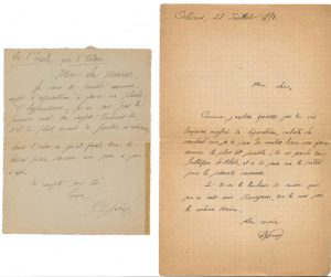 de Puiseaux, Loiret). Orléans 14 novembre 1890. « Reviens vite au bahut. Le pion est chic pour les philos. Nous sommes ou plutôt nous serons huit en classe [...] Pour ce qui est de bouquiner en étude tous les gens dont tu me parles, je n’en sais trop rien [...] Dépêche-toi : les cours (des profs) marchent. J’ai déjà trois cahiers de philo. On ne m’a point fait part de la mort de Tartarin. J’ai cessé de me laisser vivre : les types m’ont élu président à la place de feu Rodiet. Cela me fait de quoi m’occuper »... 28 juillet 1891. « Comme j’espère encore que tu vis toujours, malgré ta séparation subite de vendredi soir, je te prie de vouloir bien me faire savoir le plus tôt possible si tu as gardé ton Jallifier de Rhéto, et si tu peux me le prêter pour les présentes vacances »... [Collège] Sainte-Barbe [1893-1894]. Il propose de se retrouver au Théâtre Français, le dimanche, ou le samedi suivant avant de prendre le train pour Orléans : « il n’est tel que le théâtre pour vous mettre en train de bavarder »... De l’École, rue d’Ulm [7 novembre 1894]. « Je viens de prendre comme sujet d’exposition à faire en philo : “L’hypnotisme”. Je ne sais pas le premier mot du sujet. Voudrais-tu, s’il te plaît, avant de partir, m’indiquer, dans l’ordre, ce qu’il faut lire là-dessus pour savoir un peu ce que c’est »... Orléans jeudi matin [vers 1895]. « Je crois savoir que tu pars de mardi en huit. Si tu veux bien, nous passerons quelques heures ensemble dimanche prochain – sans doute chez toi pour que je voie ce que tu as fait »... Il donne l’adresse de l’École Normale, rue d’Ulm.