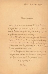 pourra venir le 14 Juillet, « parce qu’il faut que le lendemain j’aille au bureau. Retenez-moi le premier étage du château de Bizy. Je pourrai de la fenêtre me mirer dans l’étang »… Samedi [24 décembre]. Il l’attendra mercredi : « j’ai l’esprit assez sombre, et il faudra plutôt me gâter que me faire des scènes comme chez le tailleur ». Il a fait une nouvelle illustrée pour le Figaro de Noël [Toi] : « On y voit Jésus-Christ en personne »… Jeudi soir [20 janvier 1905], après une rencontre manquée : « J’espère que vous aurez un pardon pour toutes mes fautes et que la prochaine fois vous ne m’attraperez pas trop tout de même. D’autant plus que l’année ne fait que commencer, que je compte me corriger de mes nombreux défauts avant qu’elle ne soit écoulée »… 26 mai 1905 : « Votre fils habite maintenant 31, quai Bourbon » ; il faut« frapper très fort à la porte parce que quand la fenêtre est ouverte, on n’entend pas »… Cérilly 11 août : « Je suis à Cérilly depuis huit jours. Je vais travailler dans un petit bois de sapins où j’ai pour compagnons des écureuils, des tourterelles et les souvenirs que j’ai de mes amis à Paris »… Paris 22 décembre : condoléances pour la mort de la mère de Suzanne Carassale. 1er août 1906 : il fait très chaud à Paris ; il va toutes les semaines à la campagne [Carnetin] « où nous avons loué à plusieurs une petite maison. [...] je suis en train, au bout de deux ans, de terminer enfin mon livre [Croquignole]. Je n’en perds pas une bouchée. Ensuite, je me coucherai sur le flanc et je resterai huit ans sans rien faire » ; il s’est mis à la peinture et « compte vendre mes tableaux au Musée du Louvre »... Juin 1908 : rendez-vous manqués ; il va au Théâtre Antoine ; il veut lui « serrer la main » avant de quitter Paris… 27 avril 1909 : il donne le numéro de téléphone de Francis Jourdain : « Francis m’a montré ses toiles. Il y en a deux qui vous plairont beaucoup, je crois »… 26 mai : il a reçu l’argent pour Francis Jourdain, qu’il lui envoie… On joint 1 L.A.S. de Francis Jourdain à Suzanne Carassale (11 mai 1909), au sujet du tableau qu’elle a choisi ; et 5 lettres (1 L.A.S., 1 L.S., les 3 autres dictées) de la « Veuve Philippe » (mère de Charles-Louis Philippe) à Mme Carassale (1908-1911) ; elle demande des nouvelles de son fils ; elle s’inquiète : « j’espère bien comme vous que cette folie de sa jeunesse [sa liaison avec Milie] va se terminer » ; elle envisage un séjour chez son fils à Paris ; après la mort de son cher Louis, elle prévient de l’inauguration du buste sur sa tombe, et s’enquiert d’Emma Mac Kenty, qui a au moins 300 lettres de son fils.