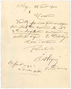 Vitalie RIMBAUD, née Cuif (1825-1907) mère du poète. L.A.S. « Rimbaud », Attigny 28 août 1900, à l’administrateur du Sagittaire [F.-A. Cazals] ; 1 page in-12, adresse (carte-lettre). Elle demande que lui soit envoyé « le N°3 du...
