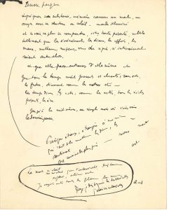 voir, ne plus se comprendre, s’être toute présente, subtile tellement que les événements, les dieux, les effrois, les maux, malheurs, suspens – vus de si près, si intimement soient autre chose [...] et que tous les temps soient présents et absents, sans ordre, le futur, diamant comme les autres et – les temps divers, les actes, comme les astres, tous les siècles présents, les ères »... Au verso, ébauches de vers : « Je laissais se mourir le timbre de ma voix », et « Terre rude et mêlée à l’algue porte moi », avec des listes de mots...