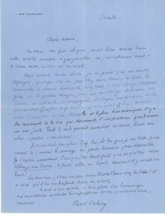 la châtelaine de Montrozier pendant l’Occupation. 1941. [Montrozier (Aveyron) début septembre]. Il se sent vaseux, mais il est levé depuis 6 h et il travaillote. « M. Rey doit être le beau-frère de ma fille. S’il est chargé des missions, inutile, je crois, de sonner Albert Ier »... Montpellier [13 septembre]. Il se sent dépaysé, après avoir pris l’habitude, chez la comtesse, d’être choyé, et « de goûter chaque jour un mélange délicieux de loisir, de solitude, de compagnie, de vague méditation et de conversation (parfois trop hardie – je m’en excuse) ; bref, de vivre selon l’amitié la plus simple et la plus harmonique »... Dans son « Abbaye aux Dames », il était « un peu mon Dritte Faust chez les Fées »… Marseille 17 [septembre]. Il réitère le charme de son séjour à Montrozier, « ce temps d’intimité charmante... et de bouillons de légumes ». Il annonce son départ pour Vichy, « puis Paris, la zone occupée – la scissure. Cependant, il a fallu des catastrophes et cette affreuse mesure pour que nous nous connaissions mieux »... Paris 10 octobre. Il évoque avec reconnaissance son séjour alors qu’il était « en mauvais état » et « patraque »… Il va recommencer son cours… « Dites mille choses pour moi à Madame la Mer et à Monseigneur le Soleil. Le 30 de ce mois, il y aura 70 fois que ce grand astre aura joui de ma présence »... Jeudi. Invitation à entendre chez le Dr Bour, « Mary Marquet dire un peu du Narcisse », avec des pièces pour flûte et piano jouées par Gaubert et Maas ; il prie le comte d’appuyer sa demande de « médaille de vieux serviteur » en faveur de son « antique cuisinière »... 21 décembre. Il ne veut pas laisser « filer dans le sablier cette mourante et obscure année » sans rappeler les jours « doux et indisposés […] passés dans l’Abbaye aux Dames, légumes compris »... 1942. 18 avril. Il est « en pleine… rogne », ayant reçu son laissez-passer en retard : sa conférence à Lyon, et sans doute Limoges et la visite à Montrozier sont manqués. « Ah ! Les printemps m’en veulent ! La bêtise des poètes, d’avoir chanté ces pubertés agrestes ! […] Je mets à vos pieds un nerveux et lamentable vieillard et ami ». [Limoges 22 mai]. Instructions concernant divers objets laissés à Montrozier, dont un calepin et des livres (Joyce). Le Dr Périgord lui a radiographié « ce fameux estomac nerveux. Il a fait mieux. J’espère, grâce à lui, avoir [...] de quoi chausser mes pieds ! – Quant à la conférence, elle fut ce qu’elle fut. Théâtre plein »... [Paris] 18 juin. Il ne sait ce que sera son été, mais pense au « château ami […] M. votre époux sort d’ici. Je lui ai exhibé de sales manuscrits dont celui de la J. Parque »... 10 août. Il a eu des ennuis, dont l’hospitalisation de sa fille, « et puis la maudite insomnie. Et je devrais travailler plus que jamais ! » Il craint aussi les conditions de voyage : « la vie est impossible aujourd’hui. Pardonnez-moi de vous écrire dans un flot d’humeur massacrante »... 24 août. Sur son imbroglio d’été : accident de sa fille, chute de sa femme, projets de voyage en zone franche, et « peu de rendement utile. Mais, à quoi ? On m’a refusé le papier du volume tout prêt »... 2 septembre. Mme J.V. [Jean Voilier] ne peut le recevoir à Béduer. « D’autre part, j’ai ici femme et fille en état peu prospère ». Mais il espère aller à Montrozier, et « un peu encore m’abriter sous votre aile, poussin de 71 printemps ! Et de quelle humeur ! Car je suis de la pire. Le travail en masse mais tant d’autres idées en tête »... 21 septembre. Il sera son hôte pour peu de temps : « Mon papier rouge est consumé aux deux tiers et je laisse ici beaucoup de travail que ce vilain été n’a pas voulu accomplir »... Lundi [19 octobre]. Récit de sa nuit de retour en train, où trois paires de narines exécutaient en canon dans une atmosphère sans courant d’air, le Nocturne en dodo mineur » ; remerciements... 18 novembre. « Je travaille. Mon cours reprendra le 9 janvier. Mais il faut faire aussi bien d’autres choses que j’avais acceptées en prévision de ma cessation de fonctions ! Figurez-vous que les M.P. font quelque bruit. Même si à l’Académie et des gens imprévus se réjouissent ou se scandalisent de les avoir lues... Un directeur connu de théâtre de genre veut absolument que je fasse qq. chose pour lui »... [4 décembre]. Évocation d’un dîner donné par M. Gay au Fouquet : « Il y avait aussi des frites, chose presque fabuleuse »... 28 décembre. « Je trébuche d’incidents fâcheux en incidents pénibles. Pas assez de globules rouges et trop de blancs. Bref, on se délabre, et l’esprit ne se reconnaît guère plus dans ce qu’il tente de faire. Rien de plus déprimant que ces offensives de travail presque aussitôt arrêtées, noyées dans le vague et l’ennui »... 1943. 19 janvier. Remerciement pour le « pavé veiné d’azur », et l’« alérion » ; une bronchite l’a empêché de reprendre son cours : « 30 leçons à créer et à débiter !.. Le pauvre vieil homme en est accablé d’avance » »... [Janvier ?]. Il devrait être en chaire, mais il est au lit, démoli. « L’année s’y prend fort mal avec moi. Il n’y a qu’un avantage à ce triste état – c’est de raviver le souvenir des soins, tendres bouillons, bêtises tolérées quant aux propos, canules transcendantes »... 20 juillet. Spirituel remerciement pour l’envoi de roquefort ; il pense « au départ vers vos mâchicoulis. Bientôt le petit vieux, dans son plaid à carreaux, / Viendra vous demander le sommeil de la nuit. / Lui qui tombe le jour, lourd comme ses paupières, / Espère à Montrozier, toutes grâces rendues, / Retrouver (sauf respect) bien des choses perdues »... 3 août. Il a retenu sa place pour Rodez. « Si j’en croyais maint dire ou pronostic, je n’aurais pas b