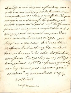 VOLTAIRE. L.A.S. « Voltaire », Colmar 14 novembre 1753, [à François-Louis Defresney] ; 1 page in-4. [III, 3607] « Il m’est arrivé de Paris à Strasbourg une malle contenant des papiers de famille avec une petite partie de ma vaisselle...