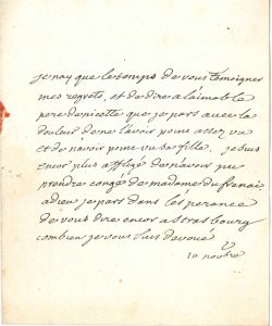 mes regrets, et de dire à l’aimable pere de Nicette que je pars avec la douleur de ne l’avoir point assez vu et de n’avoir point vu sa fille. Je suis encore plus affligé de n’avoir pu prendre congé de Madame du Frenai. Adieu je pars dans l’espérance de vous dire encor à Strasbourg combien je vous suis dévoué. »