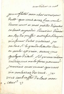 correspondant que vous avez bien voulu donner cours à mes petites dépeches. Ce serait aujourdui l’occasion d’écrire au Roy de Prusse. Autrefois il daignait m’informer de ses victoires. Je ne scais si la grande bataille dont on parle est vraie. Auriez vous quelque détail, s’il y a une relation voudriez vous me la faire parvenir ? Jaimerais encor mieux que vous me parlassiez de vous. Je vous embrasse de tout mon cœur ».