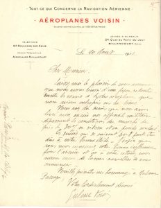 l’Aéro-Club et ses concurrents). Gabriel Voisin (1911, à en-tête Aéroplanes Voisin, sur les essais réussis de son hydro-aéroplane). Lettres à en-tête des Aéroplanes A. Deperdussin et de la Société « Zodiac », 1912-1919. Conclusion d’un manuscrit consacré au torpilleur aérien Santos-Dumont. Programme de banquet de l’Aéro-Club de France, 1924, avec quelques signatures. 2 photographies aériennes.