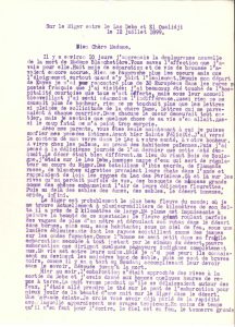 natal (l’ingénieur Maurice Louvel ou Madame, Alfred ou Félicie Schalck de La Faverie), écrite principalement au cours de missions d’exploration du Soudan français (1898-1899 et 1902), de Siguiri, Djenné (sur le Bani), sur le Niger, Tombouctou, Ndellé (États du Sultan Snoussi), Matadi (Congo belge), Krébedjé, etc. : conditions de voyage et de vie, son travail de botaniste, impressions d’Afrique « si mystérieuse » et des indigènes, témoignages sur les chefs, leurs troupes et leurs esclaves, texte et traduction d’une chanson en langue Bambara, etc.