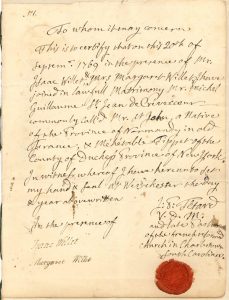 Platt, New York 2 novembre 1783 ; 1 page in-fol., sceau aux armes sous papier; liée par un ruban vert à un autre document (1 page in-4 avec sceau de cire rouge) ; en anglais (fentes). Certificat de mariage. Acte notarié rédigé par William Seton, par lequel Aaron Burr et Richard Platt certifient l’authenticité de la signature du Révérend John Peter Tétard sur le document annexé : attestation écrite et signée par John Peter Tétard, ancien pasteur de l’Église française réformée de Charlestown (Caroline du Sud), qui certifie avoir marié, le 20 septembre 1769, M. Michel Guillaume Saint-Jean de Crèvecœur, appelé communément Mr. St John, natif de la province de Normandie en vieille France, et Méhétable Tippet, « of the County of Duchess Province of New York », en présence des témoins (qui signent) Isaac et Margaret Willet.