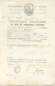 FÉCAMP. Environ 65 lettres ou pièces signées, début XIXe-début XXe siècle. Permis d’embarquer (1800). Correspondance du commissaire de police de Fécamp Banse, 1806-1808 (surveillance des côtes, signalements, pêche, arrivée...