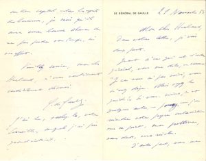 sa lettre : « vous me dites, en somme : “Je ne vous ai pas suivi, vous m’avez déçu. Mais soyez le guide !” Si vous-même – et quelques autres – pouvez un jour résoudre votre propre contradiction sur ce point, mon problème, sans doute, sera résolu »... Quant à l’Indochine, et au projet d’un éventuel départ d’Herland pour Hanoï : « Mon sentiment, qui est aussi celui de [Jean] Sainteny, du général de Beaufort (commission de contrôle) et de [René] Capitant (qui revient tout justement d’Hanoï et m’en a parlé), est qu’il faut et qu’il est possible de garder une place à la France au Tonkin, aux points de vue : culturel, économique et même politique. Le Lycée français est accablé de demandes d’inscription. Mais, bien sûr, si nous continuons comme le régime l’a toujours fait et continue de le faire, à n’avoir pas de politique “française”, (mais le régime en est-il capable ?), nous perdrons ces cartes-là, aussi. Il me semble, cependant, qu’on peut, dans une certaine mesure, prouver le mouvement en marchant. Si un homme de valeur et d’ardeur va, maintenant, à Hanoï pour servir la pensée française, c’est-à-dire un lien capital entre les esprits des hommes, je crois qu’il aura une bonne chance de ne pas perdre son temps, ni ses efforts »... Il ajoute qu’il a pris un « grand intérêt » à la lecture de son ouvrage sur Corneille [Corneille par lui-même]. On joint une carte de visite avec 4 lignes autographes, signée « C.G. », à Herland : « Merci, mon cher Herland, de votre témoignage dont j’ai été touché. Bien cordialement » ; une carte en fac-similé ; 2 longues minutes autogr. de lettres de Louis Herland au général (Toulouse 30 janvier et 13 juillet 1957) ; et 1 l.s. de Xavier de Beaulaincourt, secrétaire du général (1948).