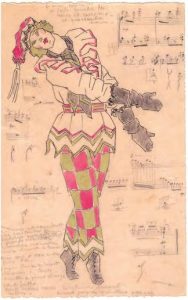 Dessin avec musique, croquis de danse et note manuscrite avec musique. S.d. (1912). 1 pp. in-4. Dessin préparatoire du personnage d’Arlequin dans le ballet Petrouchka dansé par Nijinski. Importantes notes en marge au crayon touchant la chorégraphie du ballet. Le dessin servira pour illustrer le Programme officiel des Ballets Russes au Théâtre du Châtelet, en 1912.
