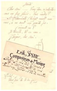 L.A. signée de son monogramme, et Carte de visite aut. (Août 1914). 1 pp. petit in-8 et carte de visite calligraphiée, recto/verso ; avec enveloppe. Invitation de Satie pour son ami Chalupt ; Venez donc m’entendre : vous me ferez plaisir. Vous viendrez. Si Mademoiselle Chalupt venait avec vous, ce me serait une grande joie. Comment va ? Je travaille comme un veau (…). Il lui joint une carte pour Gaspard Michel. Joint Carte de visite calligraphiée d’Erik Satie « Compositeur de Musique » avec note autographe ; Combien je vous dois d’excuses ! il m’était impossible de vous donner une réponse. Il n’a pas de nouvelles de Rolland et ajoute : (…) Roché m’a dit tout ce que Mademoiselle Chalupt & vous avez fait pour ma cause musicale. Merci (…). Etc.