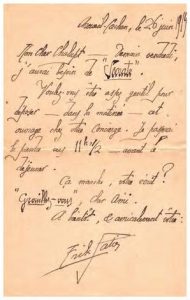2 L.A.S., à René Chalupt. Arcueil-Cachan, 7 et 26 juin 1919. 2 pp. sur carte pneumatique et 1 pp. in-8 avec son enveloppe. A propos de Socrate qu’il composa pour la comtesse de Polignac ; il attend l’article de Chalupt: (…) Cela tient, votre préface - courte & précise ? ….. Exposé net de ce que « Socrate » exprime ; sa situation dans l’art musical ; sa « nouveauté »…. C’est un écrit de « fierté » que je demande à votre amitié. Vous constatez avec « autorité » sans « discuter » (…). Plus tard, Satie lui réclame son manuscrit : (…) Demain vendredi, j’airai besoin de « Socrate ». Voulez-vous être assez gentil pour déposer - dans la matinée - cet ouvrage chez votre concierge (….). ça marche votre écrit ? « Grouillez-vous » cher ami (…).