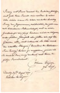 L.A.S. à une amie. Lucerne, Mardi 29 août 1870. 2 pp. bi-feuillet in- 8, en allemand. Très belle lettre de la fille de Liszt quelques jours après son mariage avec Richard Wagner. Cosima est reconnaissante des vœux adressées par sa correspondante : évoquant son récent divorce avec Hans von Bülow, elle peut maintenant se consacrer pleinement et sans réserve à son mari et lui vouer toute sa bienveillance, heureuse d’avoir bien été accueillie dans sa maison. Elle espère que son alliance avec Wagner la rapprochera de son amie, mentionnant encore son dernier fils Siegfried, les liens d’amitié entre Hans et Franz. Elle espère se rencontrer dimanche prochain en compagnie de ses cinq enfants, comptant en particulier sur Fanny.